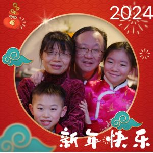 新年来到,老爸老妈和两个小孩拍两张贺岁照。