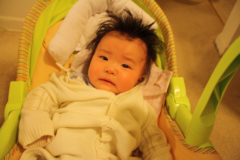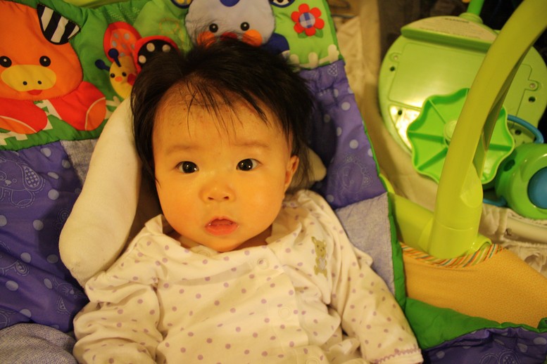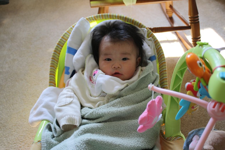 就在刚才,可儿把对爸爸的依恋化为力量,成功地在自己的宝座上翻身。