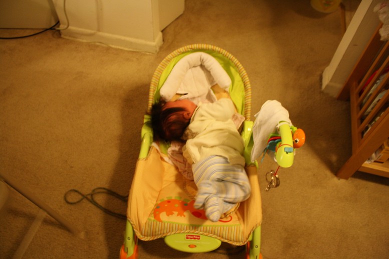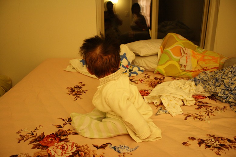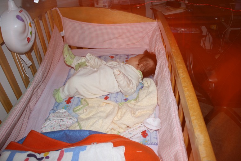 昨天晚上我们把可儿放到她自己的小床上,放得方方正正的。可是今天早上起来一看,她睡着后竟然可以把自己的身体在小床上转个这么大的角度。有照片为证。
