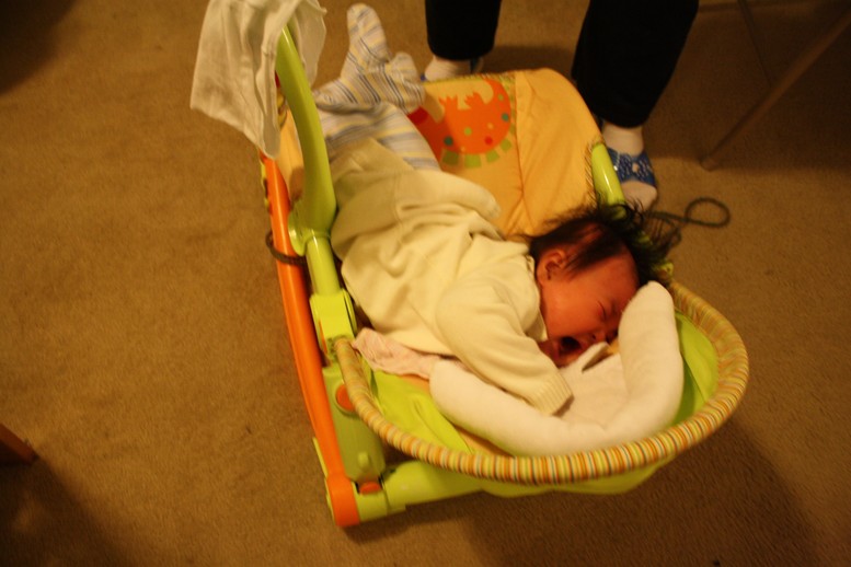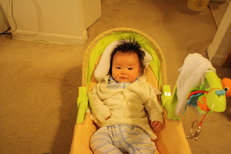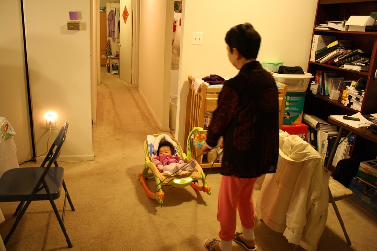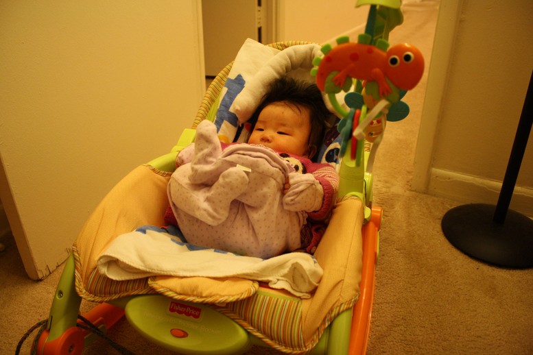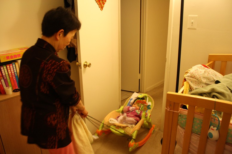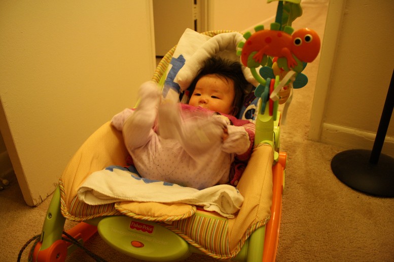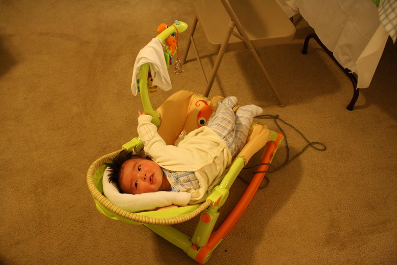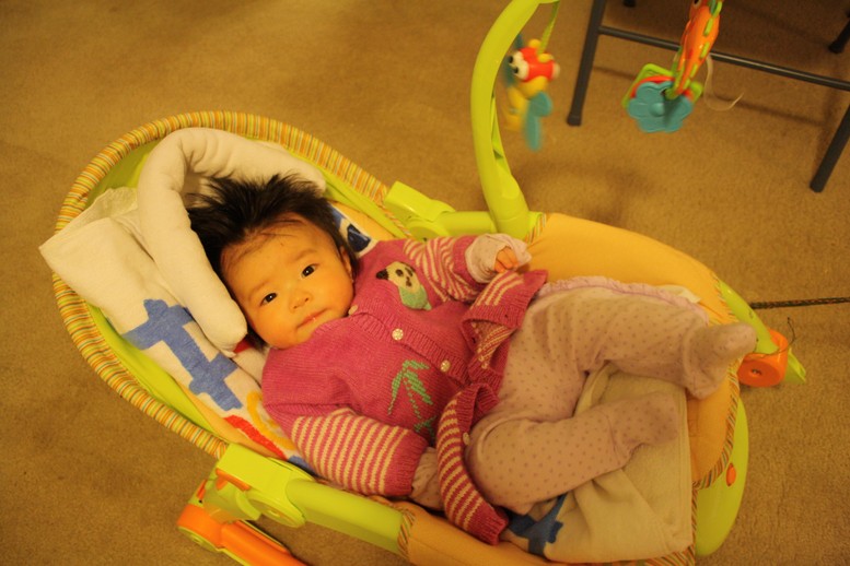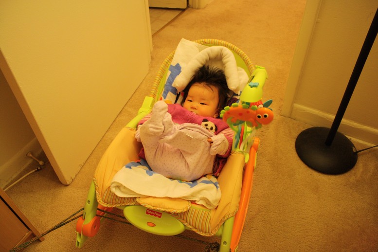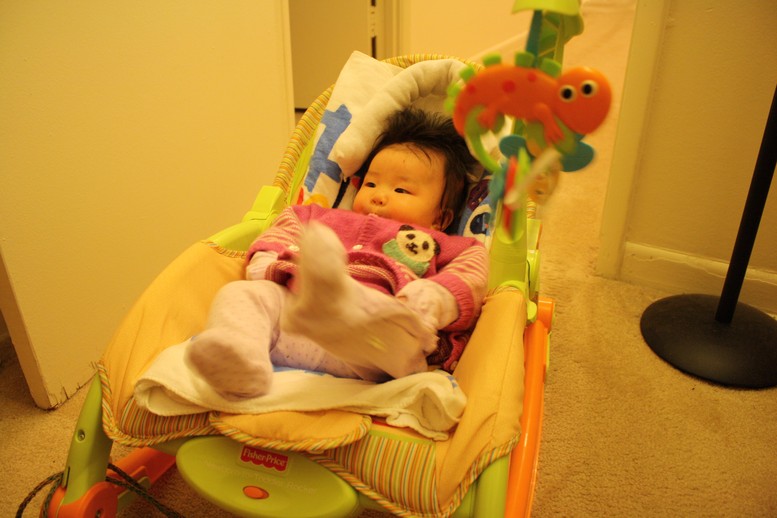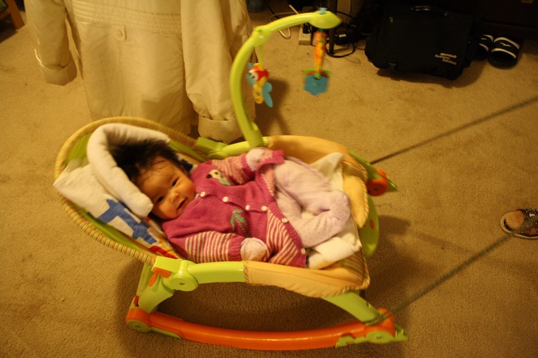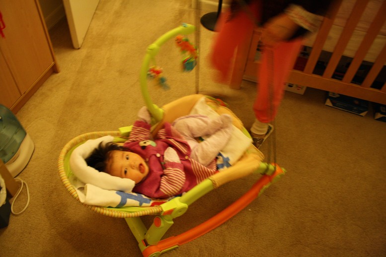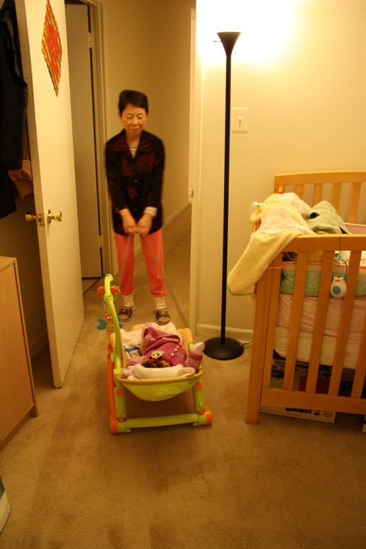 今天可儿的奶奶在可儿的小摇椅上拴了根绳子,在房子里把可儿拉来拉去,可儿很是享受这种待遇。